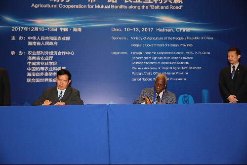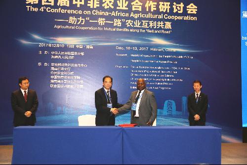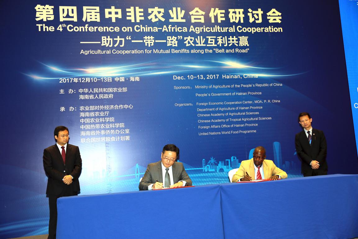 第四届中非农业合作研讨会上,在农业部党组成员毕美家、海南省副省长何西庆、商务部西亚非洲司商务参赞周兆明、国家粮食局外事司副司长曹颖君、发改委气候变化司副巡视员田成川、联合国粮农组织驻华代表马文森先生、联合国世界粮食计划署驻华代表屈四喜、非洲发展新伙伴计划规划署主任埃瑟琳·福塔邦、世界银行农业局局长西蒙·埃胡伊等国内外重要嘉宾的共同见证下,签署合作协议(备忘录)8项。